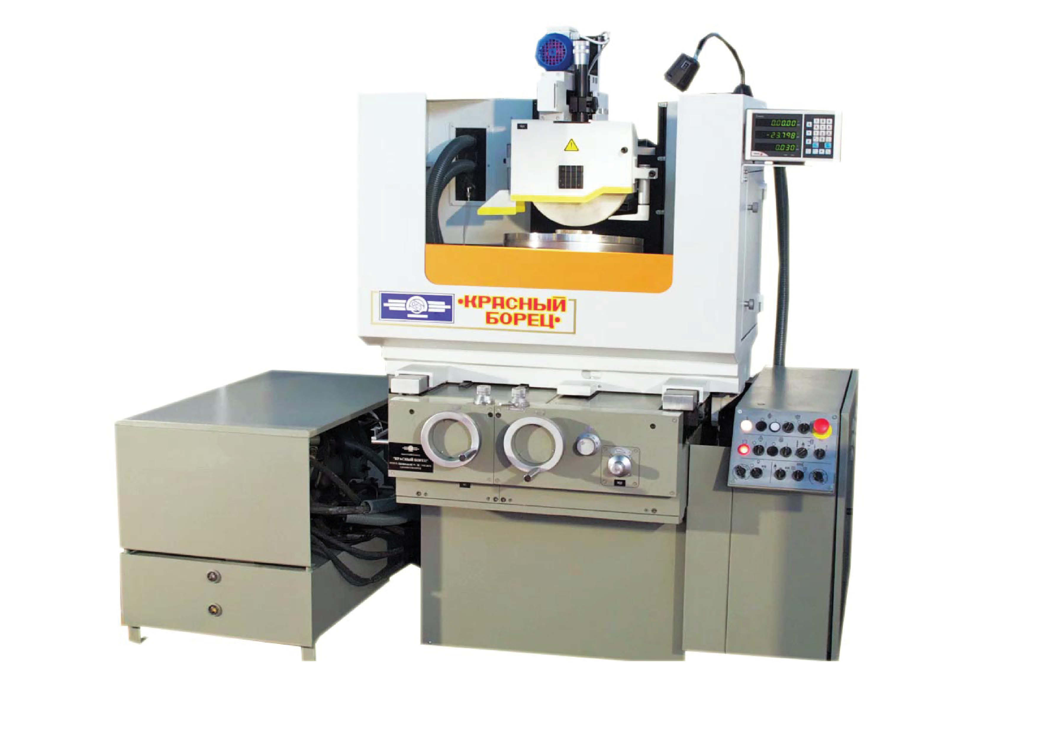 - Механизм правки шлифовальной головки устанавливается сверху на корпусе шлифовальной головки. Привод перемещений каретки механизма (перемещение вдоль оси шлифовального круга) – от асинхронного электродвигателя через ременную передачу на винт с управлением с пульта. Перемещение скалки механизма с алмазным карандашом на шлифовальный круг (подача алмаза на глубину правки) – механическое с помощью маховика