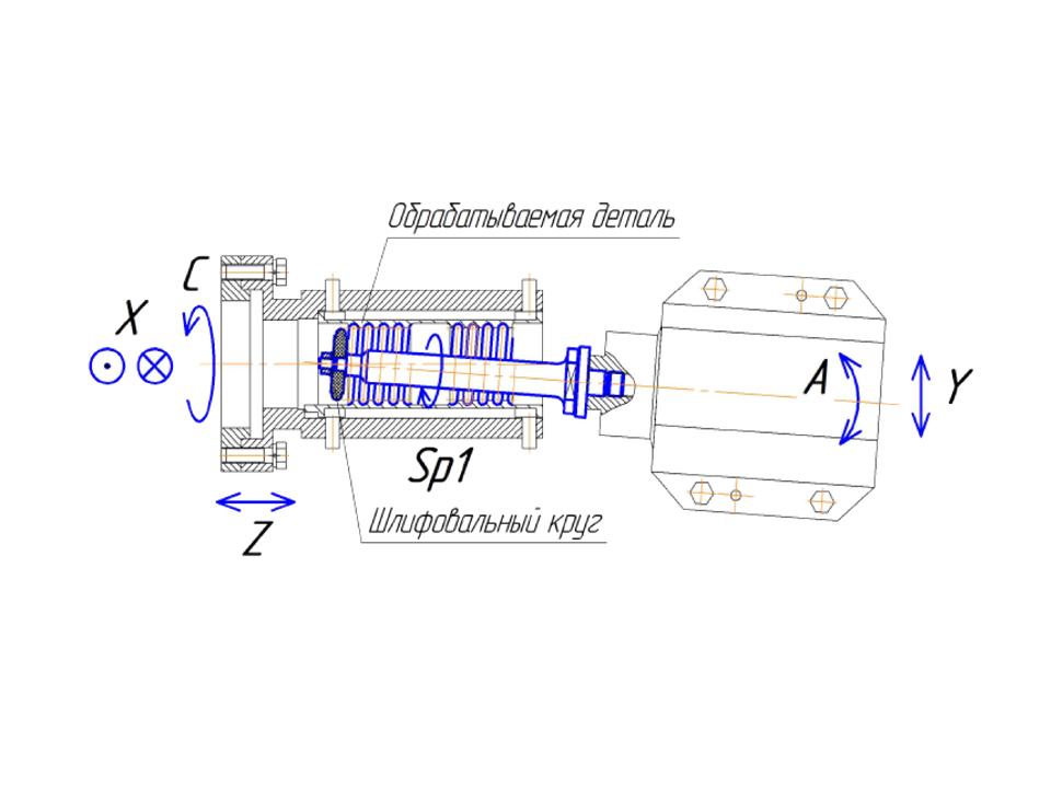 - Линейные и круговые датчики обратной связи по программируемым координатам- - поперечное перемещение бабки шлифовальной – координата Х; - продольное перемещение салазок с бабкой шлифовальной – координата Z; - угловой поворот головки шлифовальной в вертикальной плоскости (угол наклона витка резьбы) - координата А; - вращение обрабатываемой детали - координата С;