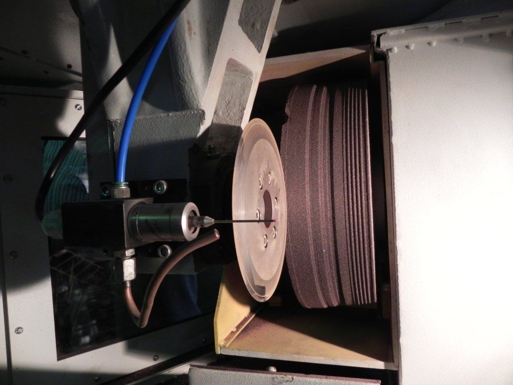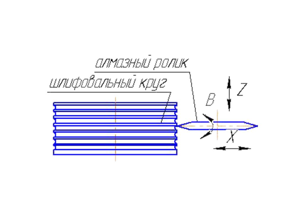 Станок имеет компоновку с перемещающимся механизмом правки в продольном и поперечном направлениях относительно неподвижно вращающихся шлифовального круга. Правка производится специальным вращающимся алмазным роликом, который имеет возможность поворота в левую и правую стороны относительно вершины радиуса (R=0.2 мм) алмазного ролика.